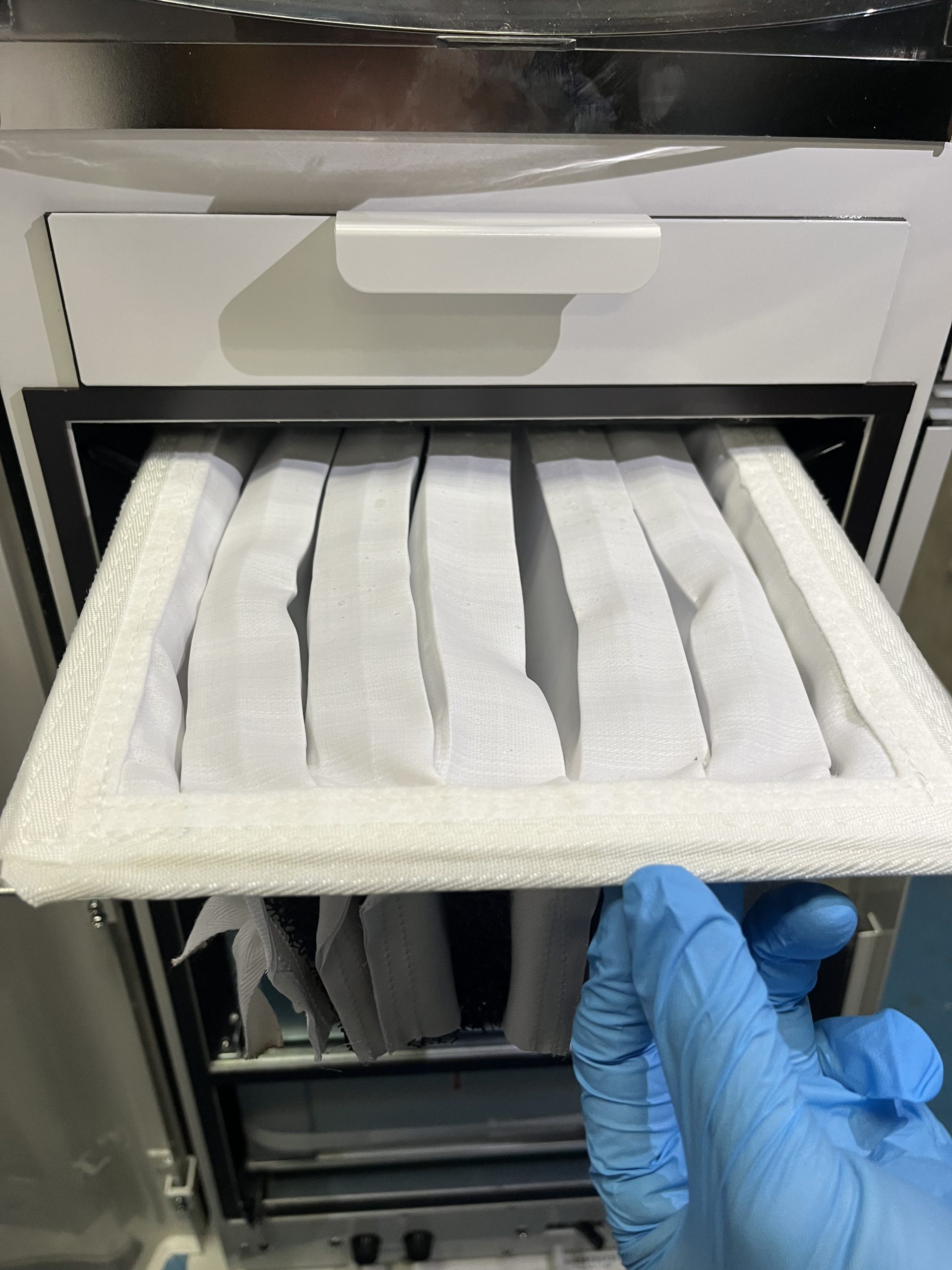本体裏側を開き、上段の白い引き出しの塵受けフィルタ(月に1回の交換を推奨)と中断のバックフィルタ(6カ月に1回の交換を推奨)をご確認いただき、目詰まりや汚れが付着している場合は、交換をお試しください。各種フィルタにつきましては、普段ご利用いただいている業者様にご注文下さい。